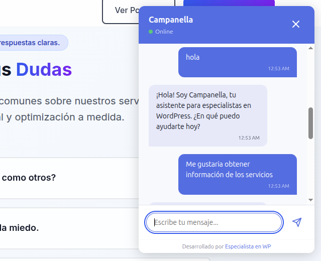 Especialista en WP Chat es el plugin chatbot WordPress gratis más avanzado del mercado, potenciado por la API de Google Gemini. A diferencia de otros plugins de chatbot IA, nuestro asistente virtual no solo responde preguntas, sino que captura leads automáticamente durante las conversaciones, convirtiéndose en tu mejor vendedor 24/7.